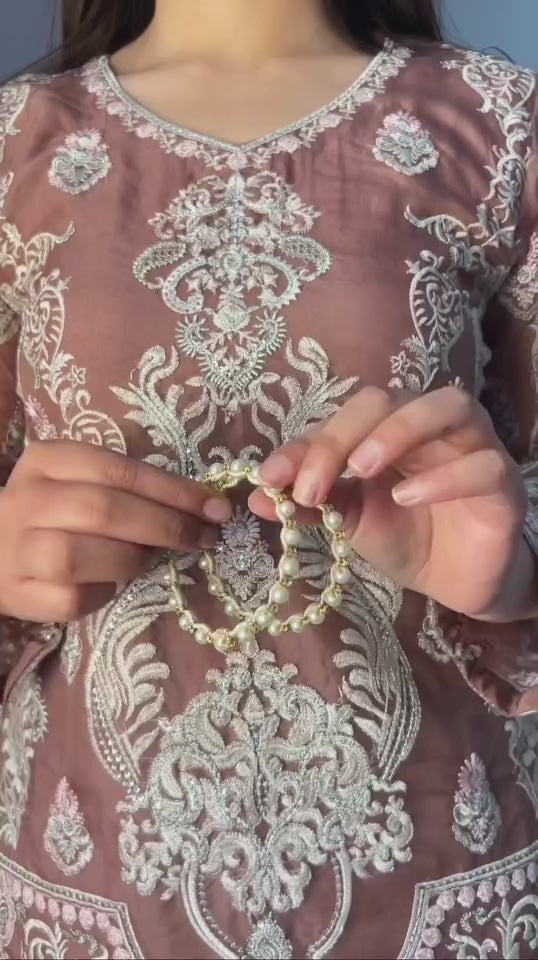 A three-piece set featuring a pure organza shirt with embroidered details. Paired with an embroidered organza dupatta and straight raw silk pants.